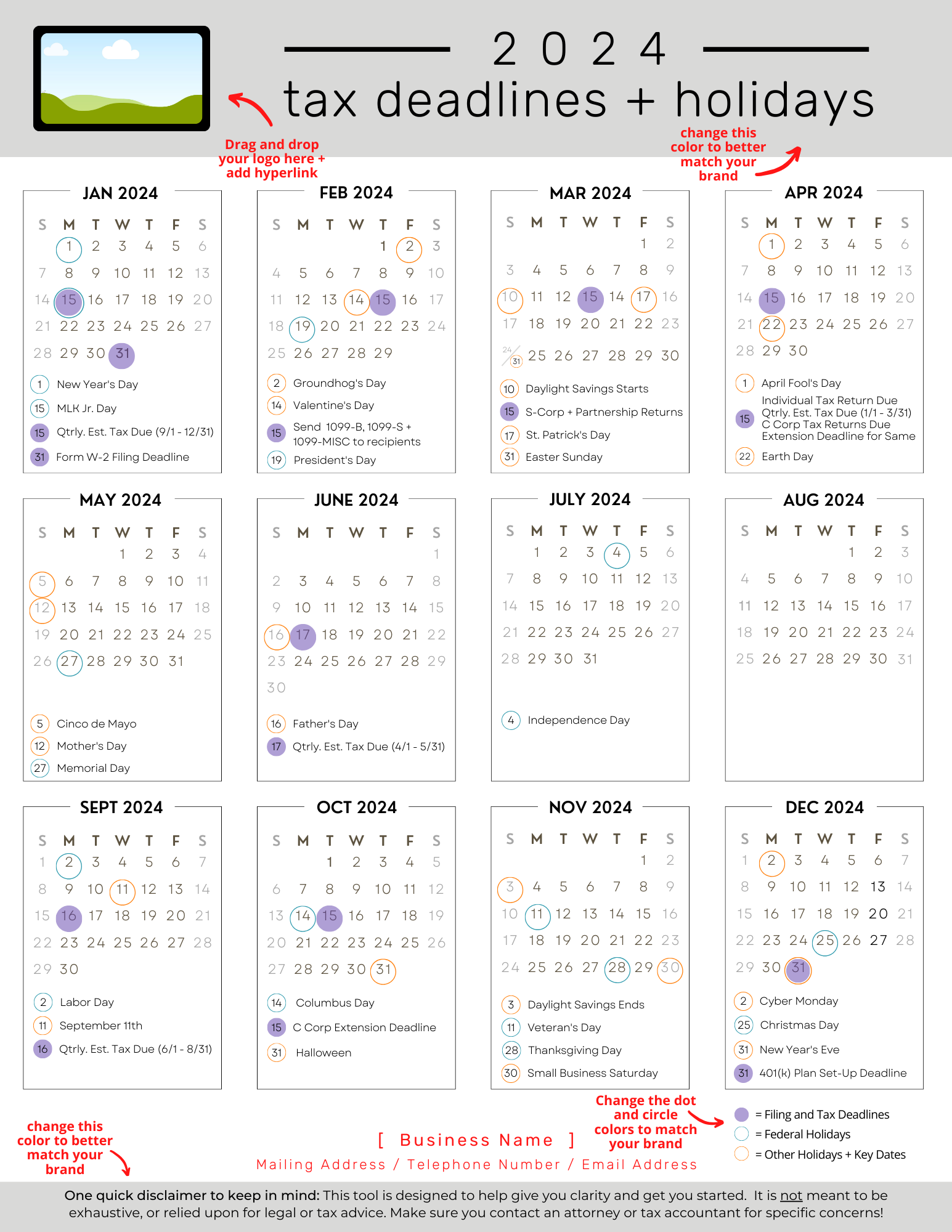 Intentional single-sheet design so your clients can tape this to their office wall for tax deadline reminders all year long ... and, conveniently, keep your contact info right in front of them all year, too ๐
