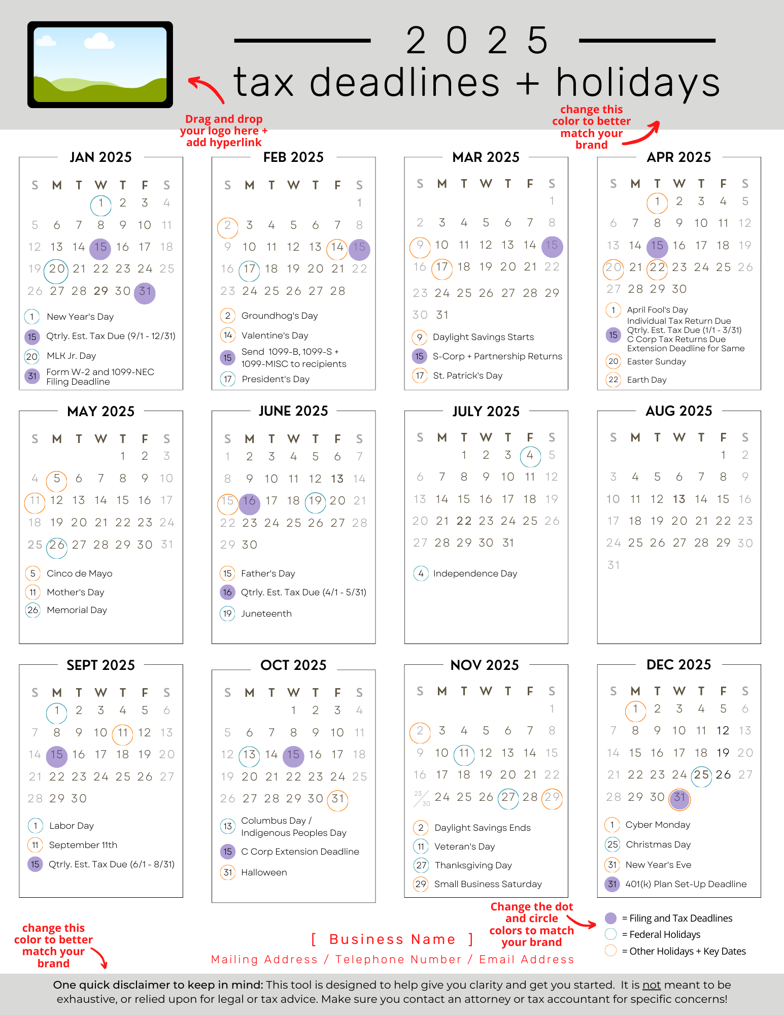 • Intentional single-sheet design so your clients can tape this to their office wall for tax deadline reminders all year long ... and, conveniently, keep your contact info right in front of them all year, too ๐Ÿ˜‰